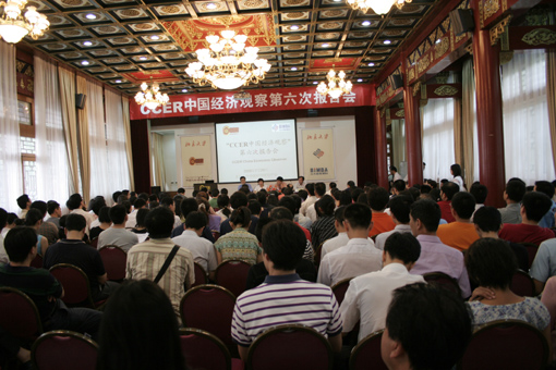 2006年7月29日下午,“CCER中国经济观察”第六次报告会在北京大学中国经济研究中心万众楼举行。北京大学中国经济研究中心教授林毅夫、上海睿信投资管理有限公司董事长李振宁、北京大学中国经济研究中心教授卢锋、高盛(亚洲)有限责任公司中国首席经济学家梁红、光大证券首席经济学家高善文、北京大学中国经济研究中心教授宋国青分别就“上半年宏观经济形势——治理措施和宏观理论思考”、“股权分置改革的经验和启示”、“入世五年看农业——我国农产品贸易和供求演变趋势”、“汇率,贸易顺差及宏观调控”和“通货膨胀与资产重估”、“中国投资率太低”做了演讲。会议还发布了有关2006年第三季度宏观经济若干指标“朗润预测”结果。中国经济研究中心师生、北大国际MBA校友、商业和金融机构以及政府、大学、研究所及众多媒体参加了会议。