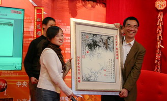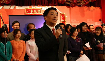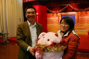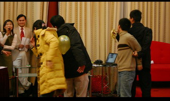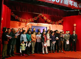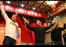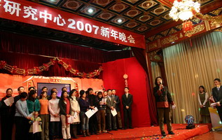 灯笼高挂,对联横中,在一片其乐融融的气氛中,中国经济研究中心2007元旦晚会拉开了序幕。第一个节目自然是中心每年的经典——老师的合唱,虽然没有伴奏带的配合,老师们高涨的情绪仍然感染了大家,一曲《我的中国心》唱出了每个人的心声。第二首歌从一开始一直处于保密状态,当老师们开口唱出时,每个人都叫了起来,原来老师们竟然也唱起了流行歌曲——super star!充分展现出中心的老师与时代紧密结合的特点,fashion不输大家呀!今年刚到中心的巫老师也携全家来到了晚会现场,并给大家献上了新年的祝福,巫老师的一句话道出了大家的心声:“中心让我感到很温暖……”。李玲老师随后也像大家介绍了每一级的学生,并像家长一样对每个年级的同学给予了殷切的期许和要求。