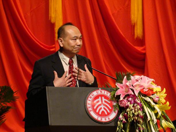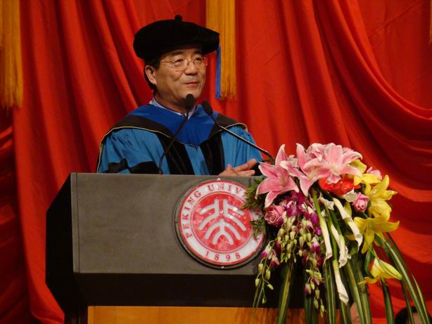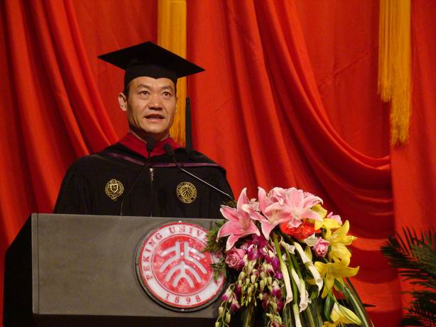 首先,由中国经济研究中心主任、世界银行高级副行长兼首席经济学家林毅夫教授致词。林毅夫首先向今年毕业的5位博士,78位硕士,70位在职MBA,70位全日制MBA,90位EMBA和587位经济双学位以及辅修的学生表示祝贺。他认为这是他们人生新的里程碑,并表示“能够在全国最高的学府最好的项目拿到了毕业证书,这证明在座的每一位是这个时代最杰出的人才”。这一天对于林毅夫教授同样是不平常的一天。下午他即将启程奔赴美国开始世界银行副行长兼首席经济学家的任职。在中心工作14年,他见证了中心的每一个成就,每一次收获,对中心充满着深厚的感情。林毅夫教授也利用这个机会恭喜同学们,因为他们毕业走出校门的时候,迎接他们的是中华民族历史上最好的发展年代。尤其在改革开放这三十年中,中国的经济经历了高速的发展,并且在未来相当长的一段时间内将继续保持高速增长,中华民族的伟大复兴不再是一个遥不可及的梦想,定将在不久的将来得以实现。同时林毅夫教授还指出,当前所处的时代还不是一个完美的时代,四川汶川的大地震让我们看到了人们所受的困难与挑战;收入分配不均、城乡差距扩大、医疗、教育等社会事业发展相对滞后、环境、资源压力越来越大等一系列影响社会和谐和长远发展的问题亟待我们的解决。最后林毅夫教授希望在座的每一位同学从北大毕业后,能够承担历史,不求个人名利,不断充实自己,树立崇高远大的理想,为国家、民族的伟大复兴贡献出自己的力量。