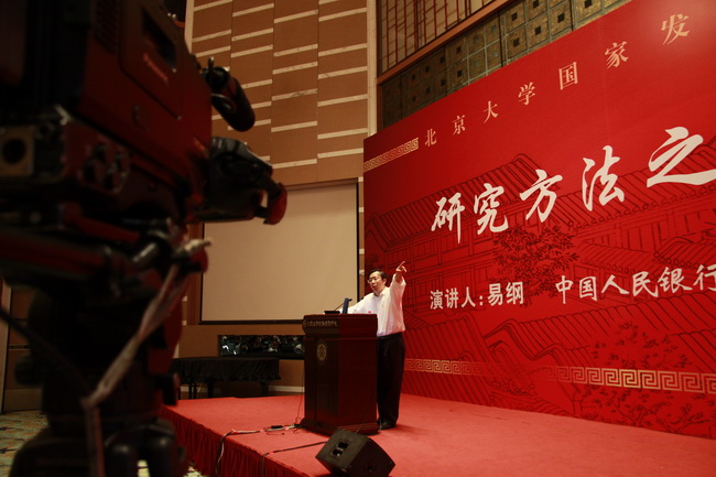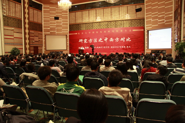 2009年10月26日晚上7点, 应北京大学国家发展研究院的邀请,中国人民银行副行长、国家外汇管理局局长易纲教授在北京大学英杰交流中心阳光大厅为北大师生作了一场专场报告,题目是“研究方法之中西方对比”。来自北大各个院系以及国家发展研究院和北大国际(BiMBA)的学生和校友聆听了这场讲座。