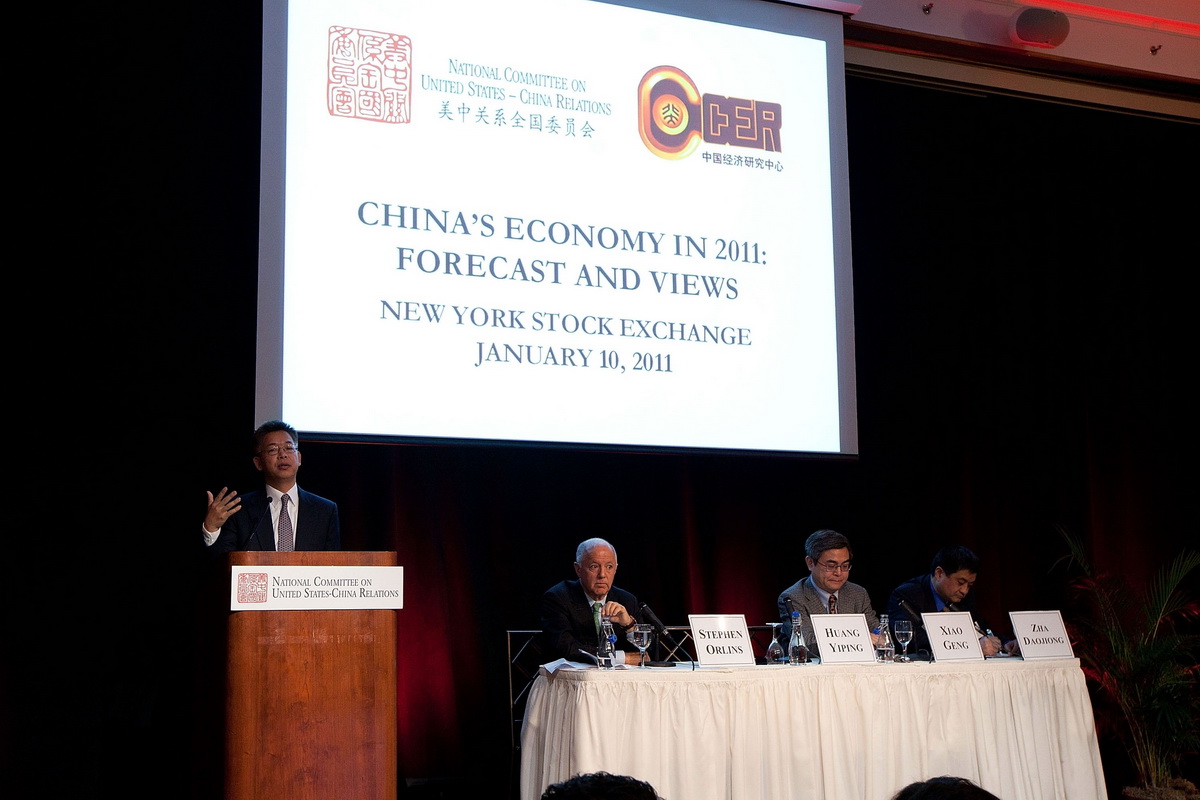 2011年1月10日上午,“2011年中国经济论坛”第二次在纽约证券交易所成功举办。论坛由北京大学中国经济研究中心和美国美中关系全国委员会联合筹办。纽约证券交易所为此专门悬挂了中华人民共和国国旗,在证交所门前圣诞树彩灯的照耀下,中美两国国旗交相辉映,来自华尔街、美国政府和研究机构的350人参加了论坛,并与中国经济学家展开了互动。美中关系全国委员会总裁Stephen Orlins先生首先发表开幕致辞,表示上次的论坛在美国高端经济界产生了相当大的影响,预祝此次论坛的继续成功。纽约证交所首席执行官 Dunean Niederauer先生致辞,介绍了在纽约证券交易所上市的中国企业的总体情况,并向中国经济学家表示欢迎。随后,北京大学国家发展研究院常务副院长巫和懋教授发表开幕致辞,介绍了北京大学国家发展研究院与中国经济研究中心,对上次的论坛进行了回顾,并预祝论坛成功。