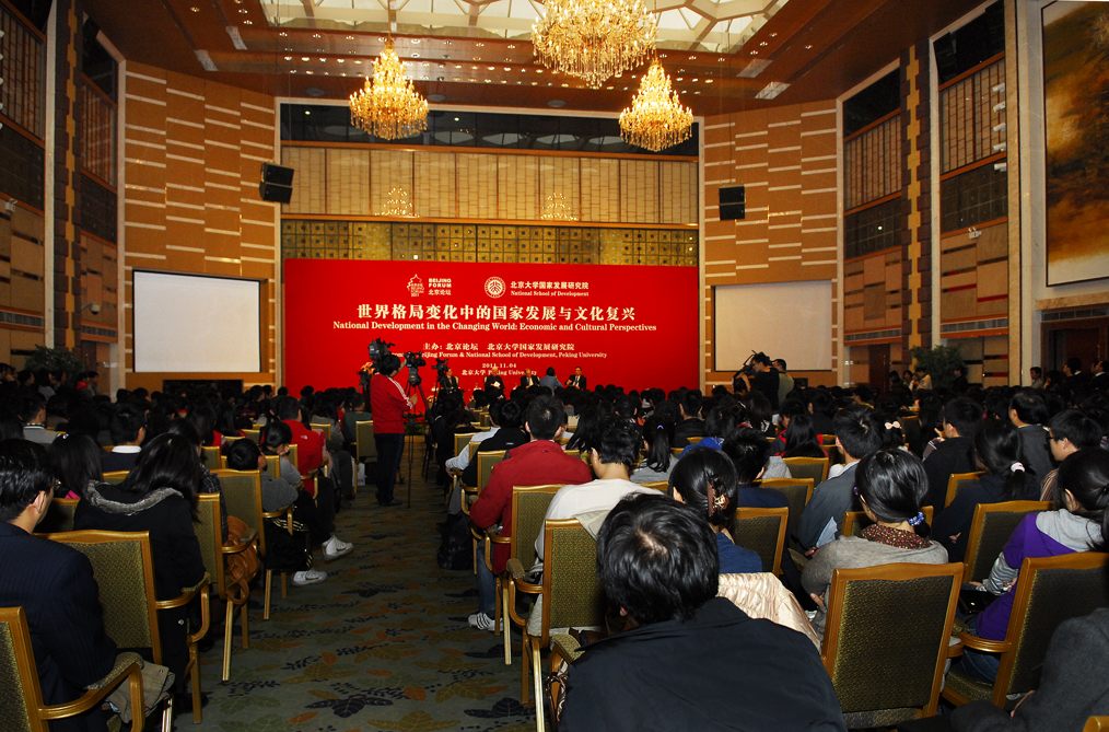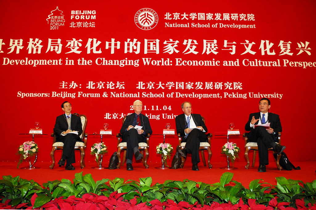一位是世界银行高级副行长兼首席经济学家林毅夫教授,他的一言一行都会受到媒体的极大关注;一位是2007年诺贝尔经济学奖得主罗杰•梅尔森(Roger Myerson)教授,他谦虚热情,甚至因为不忍心打断记者的连连发问而最后离开会场;一位是1996年诺贝尔经济学奖得主詹姆斯•莫里斯(James Mirrlees),他在博弈论和信息经济学方面做出了突出贡献,目前已经来到中国授课。这几位学者聚在一起,会产生什么样的思维碰撞呢?2011年11月4日下午,北京论坛(2011)“世界格局变化中的国家发展与文化复兴”专场对话在北京大学英杰交流中心阳光大厅举行,对话嘉宾正是这三位学者。