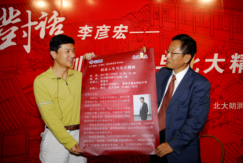11月6日晚,北京大学朗润园万众楼二楼灯火通明,北京大学国家发展研究院、北大国际(BiMBA)EMBA、MBA的在校生与历届优秀校友共200多位商业精英济济一堂,期待着当晚“朗润商道”讲坛的重量级来宾——北大杰出校友代表、百度创始人李彦宏。