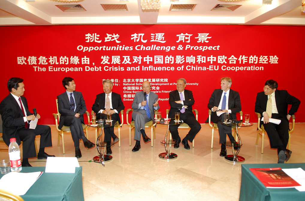 2012年5月15日上午,主题为“挑战 机遇 前景——欧债危机的缘由、发展及对中国的影响和中欧合作的经验”的“朗润议事厅”高峰论坛在北京大学英杰交流中心月光厅举行。本次研讨会由北京大学国家发展研究院、中国国际友人研究会和希腊驻华大使馆联合主办。希腊前总理康斯坦丁•西米蒂斯,第九、十届全国人大常委会副委员长成思危,中国投资公司监事长金立群担任这次会议的主讲嘉宾。欧盟轮值主席国丹麦驻华大使裴德盛,北京大学国家发展研究院副院长、北京大学中国宏观经济研究中心主任卢锋教授,中国国际问题研究所所长曲星也来到会场参与讨论。本次研讨会的主持人是中远集团投资者关系部副总经理,北京大学国际(BiMBA)07级校友荆天。