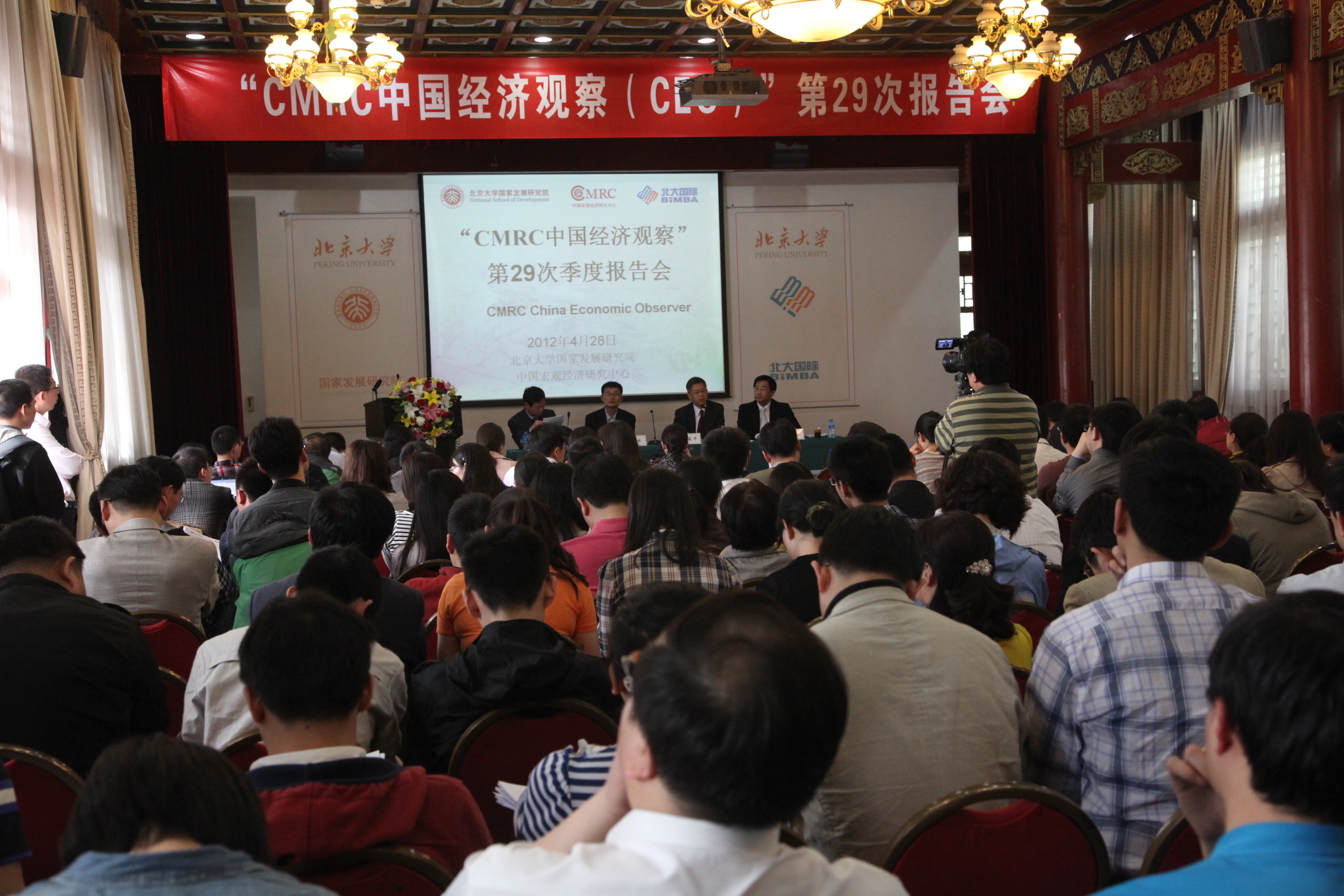 “CMRC中国经济观察”第29次报告会于2012年4月28日下午在北京大学国家发展研究院万众楼二楼举行。会议由北京大学国家发展研究院巫和懋教授和卢锋教授主持。卢锋教授根据第28次“朗润预测”汇总结果,用四句话概括25家特约机构对今年2季度我国宏观经济走势看法:“增速在筑底,通胀仍回调,外需似企稳,拐点或可期!”。本次报告会主要讨论资本项目开放、人民币国际化、当前地方债以及近期国内宏观经济形势等问题。国家信息中心首席经济学家兼经济预测部主任范剑平、社科院世经政所世界经济统计与应用研究室主任张斌、北京大学国家发展研究院黄益平教授、徐建国副教授、宋国青教授和卢锋教授发表演讲并回答听众提问,参会的美银美林大中华区经济研究部主管陆挺博士也应邀发表对宏观形势及预测看法并回答听众提问。下面摘要报告主讲人演讲内容,后续提供报告全文。