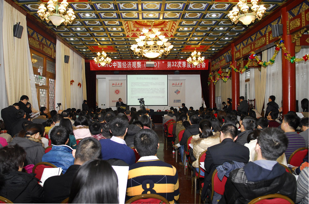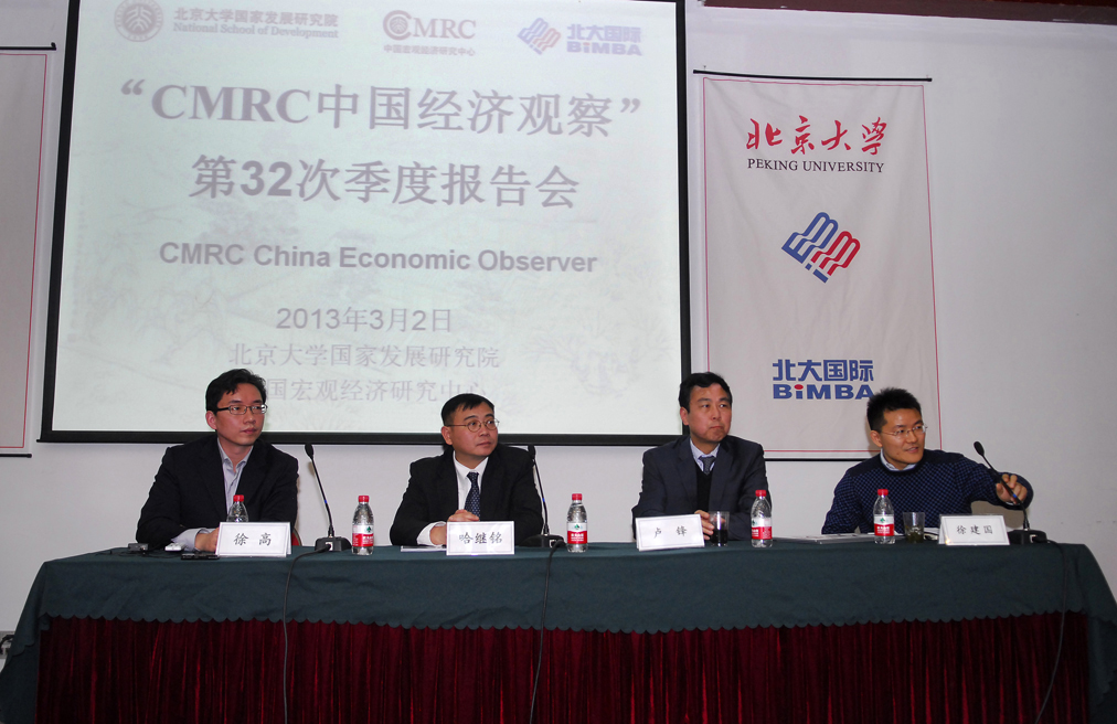 “CMRC中国经济观察”第32次季度报告会于2013年3月2日下午在北京大学国发院万众楼二楼举行。会议由北京大学国家发展研究院卢锋教授和徐建国副教授主持。卢锋教授根据第31次“朗润预测”汇总结果,用“经济温和回升,政策审慎求稳”两句话概括28家特约机构对今年1季度我国宏观经济走势看法。