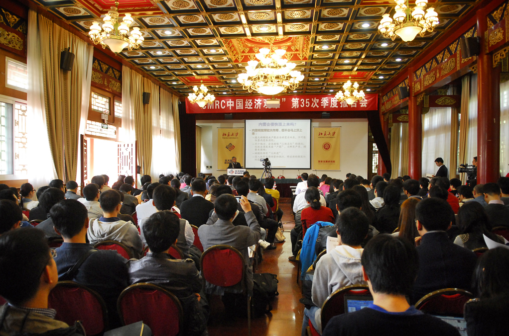 “CMRC中国经济观察”第35次季度报告会于2013年10月20日下午在北京大学国发院万众楼二楼举行。会议由北京大学国家发展研究院卢锋教授主持。卢锋教授根据4季度“朗润预测”汇总结果,用“增速‘七上八下’,通胀‘破二进三’,政策求稳谋变,‘保底’几无悬念”四句话概括25家特约机构对今年4季度我国宏观经济走势看法。