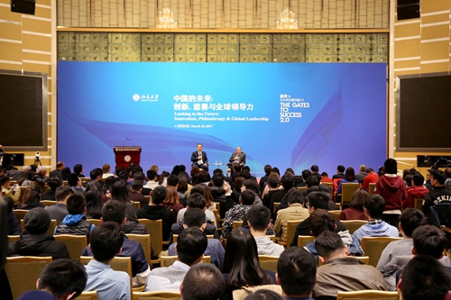 当晚,比尔·盖茨在英杰交流中心阳光厅,以“中国的未来:创新、慈善与全球领导力”为题发表演讲,数百名师生聆听了演讲并参与了与盖茨的对话。盖茨回顾了他与北大的情缘,表达了他对中国的热爱和对中国未来发展的关注。他认为,中国在全球事务中发挥着不可替代的作用,中国的年轻一代更肩负着全球进步和发展的使命。盖茨分别从健康、农业、能源和技术等四个方面阐释了当代青年应如何用青春的热情和所受的教育为人类发展贡献自己的力量。