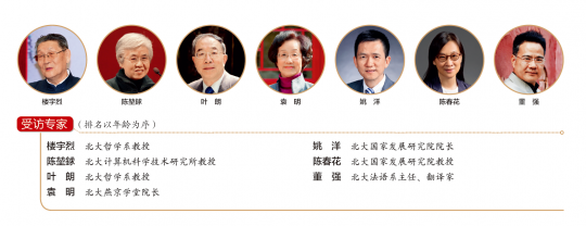 接受采访的著名教授学者包括北大哲学系教授楼宇烈、北大计算机科学技术研究所教授陈堃銶、北大哲学系教授叶朗、北大燕京学堂院长袁明教授、北大国家发展研究院院长姚洋教授、北大国家发展研究院教授陈春花,以及北大法语系主任、翻译家董强教授。