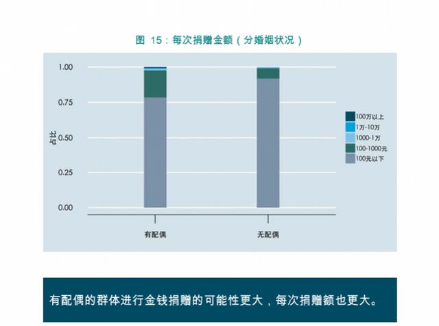 婚姻与在线捐赠行为也存在关联,如有配偶的捐赠者捐款的可能性更大,且每次捐赠额也更大。据报告,参与调查的有配偶的捐赠者中,在过去12个月捐过钱的比例为94%,高于无配偶群体的88%。同时,其中有配偶的捐赠者单次捐赠超过100元的比例为22%,也高于无配偶群体的比例(8%)。