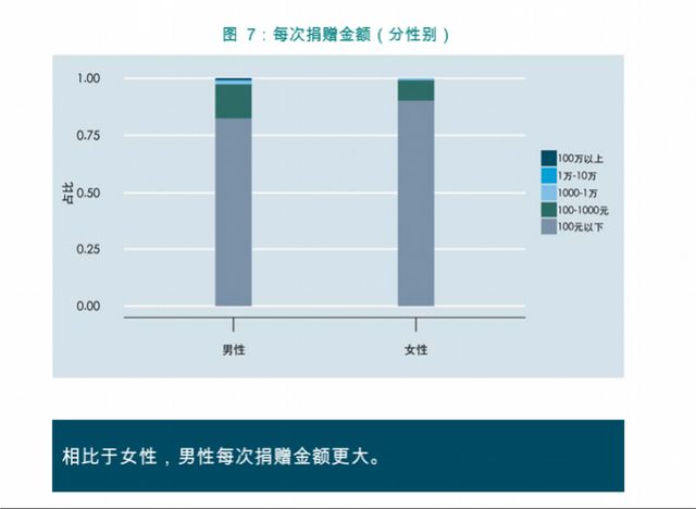 性别方面,相较于女性,男性每次捐赠的金额更大。参与调查的男性群体中,每次捐赠超过100元的比例为18%,高于女性群体的10%。女性捐款以小额捐赠为主。