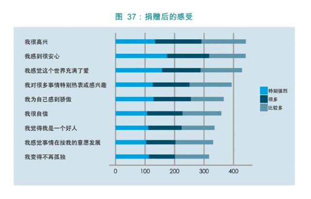 报告分析了捐赠者捐赠前的想法,也分析了捐赠者捐赠后的感受。大部分人在捐赠后都获得了积极的感受,如超过七成的人表示,捐赠后高兴、安心,“感觉世界充满了爱”。不过,26%的参与者在捐赠后不会继续关注所捐赠项目的动态进展。