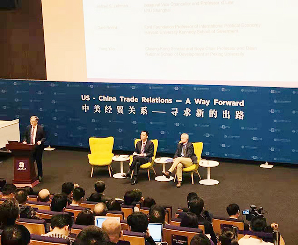 2019年10月27日上午,由北京大学国家发展研究院和上海纽约大学联合举办的论坛在上海纽约大学举行。本次论坛主题为“中美经贸关系—寻求新的出路”。来自中美的多名经济学家、法学家及相关领域专家或参与者共同与会,就中美经贸展开深入讨论,并发布了一份有37位世界知名经贸和法学专家参与的联合倡议书,希望以学术的角度和学者的担当,为近年陷入困境的中美经贸关系寻求新的出路。