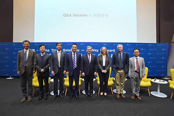 作为联合主办方代表,Jeffrey S. Lehman教授和姚洋教授分别致辞,并简述了联合研究与倡议行动的初心、起点和关键进展。随后的主论坛由两个讨论环节组成,Jeffrey S. Lehman教授、姚洋教授和Dani Rodrik教授共同参与第一环节,其他五位嘉宾共同参与第二个环节。围绕中美经贸磋商机制等热点和关键问题,嘉宾们展开学深入讨论,在阐述观点和回应分歧的基础上,还共同回答了现场听众的提问。