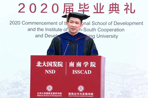 毕业典礼第八项是南南学院院长致辞兼教师代表分享环节,北大国发院联合创始人和名誉院长、北大新结构经济学研究院院长、北大南南合作与发展学院院长林毅夫教授首先祝贺南南学院今年毕业的39位同学,在疫情肆虐全球的特殊时刻,很高兴看到大家都能保持健康和平安。