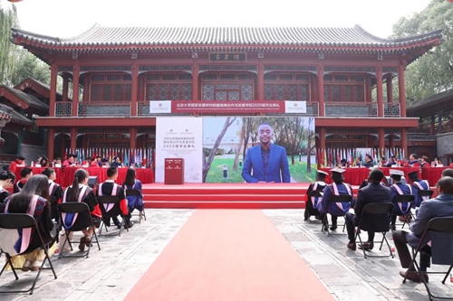 南南学院毕业生代表Chigaru Farai Anthony Muga毕业典礼第十项是隆重的学位授予环节,由于疫情影响,无法安排现场学位授予仪式。但是为了让全体毕业生获得美好的毕业回忆,学院特别为全体毕业生量身定制了全新的学位服,并作为毕业纪念寄送给全体毕业生。伴随着傅军教授、徐晋涛教授、余淼杰教授、张黎教授、宫玉振教授、汪浩教授、赵耀辉教授、姚洋教授依次上台宣读南南合作与发展学院、国家发展研究院全体毕业生名单,同学们身穿学位服的照片也相应呈现在大屏幕上。