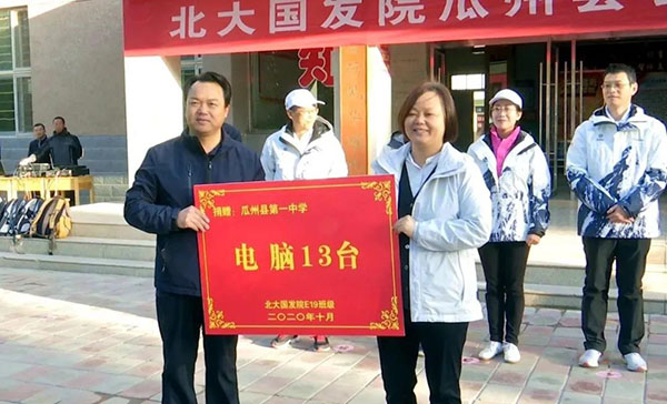 2020年10月3日,校友企业联想图像(天津)科技有限公司向瓜州一中捐赠价值11万余元的联想打印设备;北大国发院承泽户外运动协会、北大国发院戈友会副会长赵长君向瓜州一中捐赠总价值4万元的电脑,共15台;北大国发院E19班长古红霞向瓜州一中捐赠总价值3万元的电脑,共13台;北大国发院承泽户外运动协会、北大国发院戈友会宣传部部长、北大E17慈善公益基金会秘书长胡捷向瓜州一中捐赠总价值2万元的电脑,共10台。