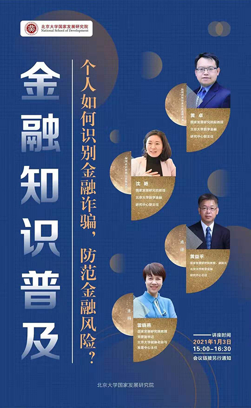 1月3日下午3:00,国家发展研究院举办线上“金融知识普及”讲座。本次讲座由北京大学国家发展研究院党委副书记、北京大学健康老龄与发展研究中心主任雷晓燕教授主持,邀请北京大学数字金融研究中心副主任黄卓教授、沈艳教授作为主讲嘉宾,北京大学国家发展研究院副院长、北京大学数字金融研究中心主任黄益平教授作总结点评;来自国发院的百余名师生在线聆听了本次讲座。