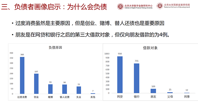 为真实呈现负债者画像,沈老师及其团队通过爬取知乎“负债者联盟”中的2720条发帖进行文本分析,由此得知过度消费、创业、赌博、替人还债是造成负债的主要原因,并且多数负债者容易陷入“以贷养贷”、“多头借贷”的恶性循环。
