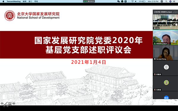 为深入学习贯彻习近平新时代中国特色社会主义思想,学习贯彻党的十九届五中全会精神,巩固深化“不忘初心、牢记使命”主题教育成果,落实党委巡察反馈整改方案,加强党支部建设,规范组织生活,提升基层党组织政治功能和组织力,发挥党支部的战斗堡垒作用,根据《北京大学基层党组织书记抓基层党建工作述职评议考核实施办法》精神,遵照疫情防控要求,2021年1月4日下午,国发院党委以线下线上相结合的方式召开2020年党支书述职评议会。院党委书记余淼杰,副书记邢惠清、雷晓燕,党委委员黄卓、王敏线下出席会议,全体师生党支部书记线上参加、各支部支委委员线上列席,述职评议会由党委组织员蒋少翔主持。