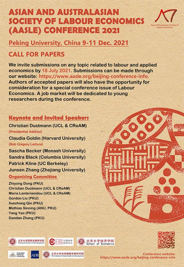 The Asian and Australasian Society of Labour Economics (AASLE) was incubated in 2016 with the primary aim of promoting research and cooperation in labour and applied economics across the region of Asian and Australasia. The AASLE Conference series is an annual gathering to discuss policies and applications in labour economics. The previous conferences were organised in Australia (2017), South Korea (2018), Singapore (2019) and online (2020). This year’s conference will be hosted by Peking University in Beijing, China on 9-11 December 2021.