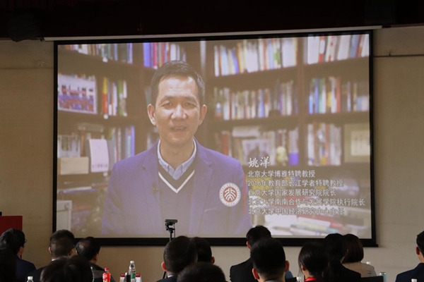 论坛线上线下同步进行国发院副院长徐晋涛教授、党委副书记雷晓燕教授、本研办公室主任蒋少翔老师、团委书记王丽雅老师出席开幕式。开幕式上,国发院院长姚洋教授进行视频致辞,向各位优秀代表的到来表示热烈欢迎。姚洋教授指出,当前我国处于经济转型时期,时代环境构成了一座经济学研究的富矿,本次论坛对参会的各位同学而言是一个良好的平台。姚洋教授鼓励同学们积极求索,祝愿同学们前程似锦。