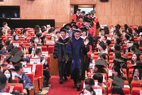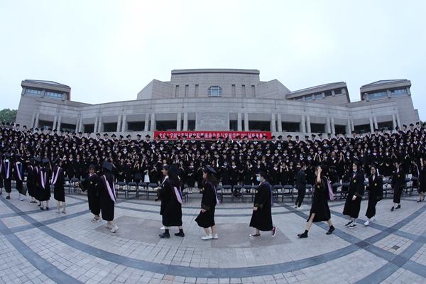 随后,最感动人的环节正式到来,所有毕业生排成一字长龙,所有教授、班主任等行政团队也整齐地列队相送。在依依惜别的乐曲中,同学们逐一走过主席台前的红毯,与陪伴自己求学生涯的老师挥别,收获的喜悦与离别的伤感交织,不少人留下激动的泪水。