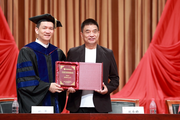 刘永好先生致辞结束,姚洋教授向其赠送本届毕业典礼演讲纪念牌。