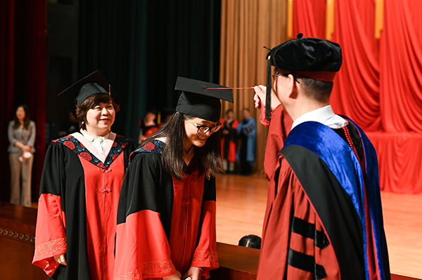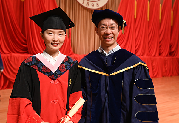 博士学位授予环节,10位博士毕业生导师带领毕业生依次上台,由林毅夫教授拨穗并与导师一起合影纪念。