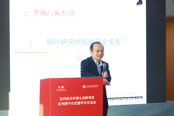 随后,中国人民大学经济学院教授、教育部长江青年学者聂辉华作了题为“如何研究中国的政企关系”的主旨演讲,与在场同仁和青年学生分享研究结果与方法心得。