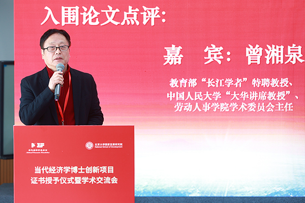 教育部长江学者特聘教授、中国人民大学大华讲席教授、劳动人事学院学术委员会主任曾湘泉教授代表劳动经济学与人口经济学组进行点评。曾湘泉教授表示,总体而言参评论文在理论、方法和成果方面都有一定的创新性。特别是选题,对于学科发展、经济建设、社会发展都有着重要的理论意义和实践价值。论文材料详实,记录严谨,文字流畅,图表规范,反映了新一代的青年学者经历系统的理论学习和严格的科学训练的特征。与此同时,曾教授也建议新一代年轻学者加强中国数据的构建、推动定性研究和案例研究,并对于博士培养给出了加强研究能力和研究设计能力的培养意见。
