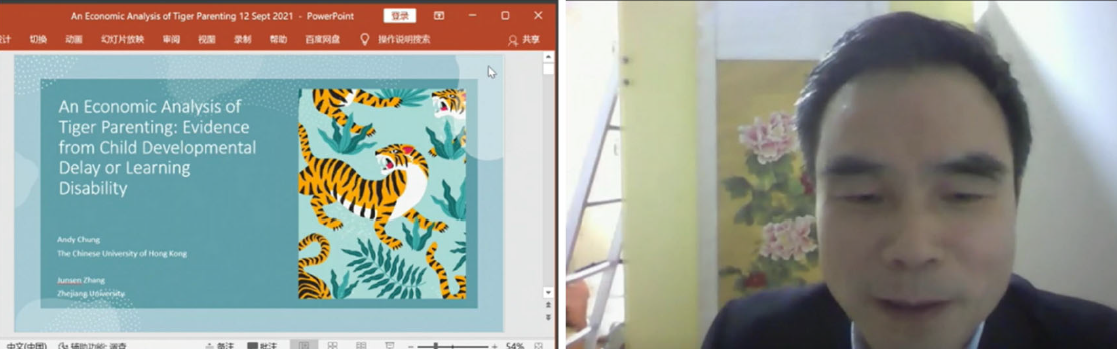Sascha Becker发表主旨演讲随后,浙江大学经济学院特聘教授张俊森作了题为“严厉家教的经济学分析——来自儿童发育迟缓与学习障碍的证据”(An Economic Analysis of Tiger Parenting: Evidence from child developmental delay or learning disability)的主旨演讲。张俊森在演讲中指出,父母家教严厉的目的是为了督促孩子努力从而提高其人力资本。然而当孩子存在先天的发育迟缓和学习障碍时,“虎爸虎妈”的严厉家教带来的收益会降低,从而降低孩子被惩罚的概率。张俊森表示,美国的一项追踪调查数据证实了这一推论,并发现父母受教育水平的提高降低了严厉家教发生的概率。