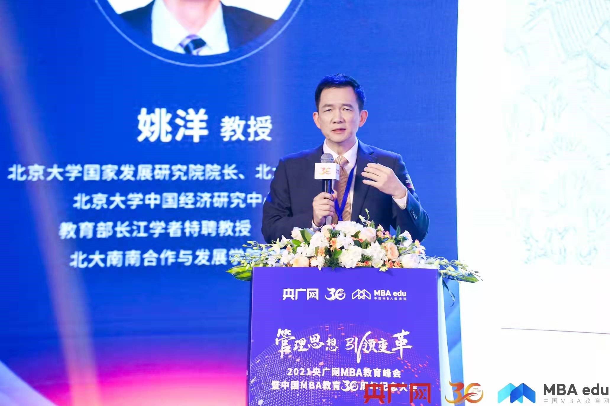 在颁奖仪式之前,作为中国MBA教育30年的重要峰会,主办方邀请了来自各大商学院的学者专家分享对中国经济、MBA教育改革与发展等相关领域的研究。北大国发院院长、南南学院执行院长、北大博雅特聘教授姚洋出席大会,并率先发表主题演讲。