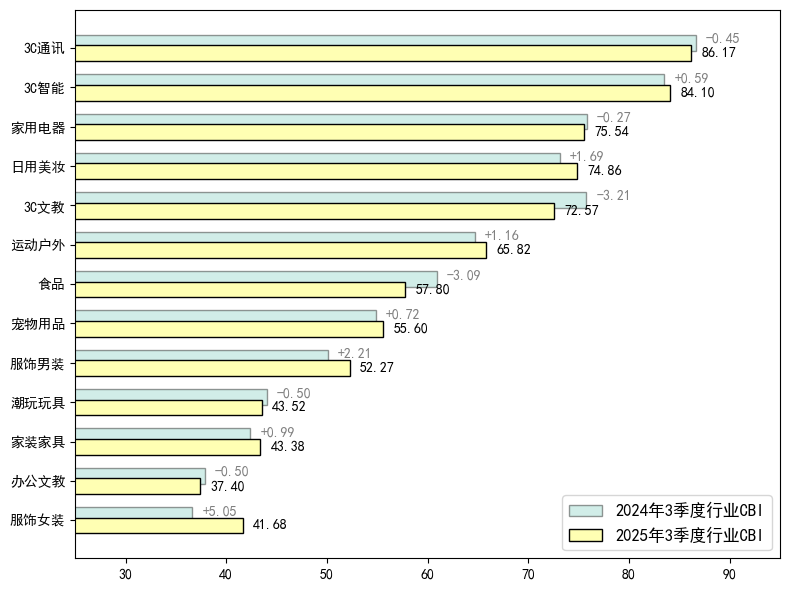 图2 部分行业的消费品牌指数对比(2024年3季度与2025年3季度)