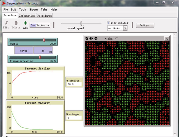 谢林的仿真程序,最初是要表明约翰逊总统的一项旨在迫使白人与黑人混杂居住在同一社区的“新政”政策注定失败的理由。这一模型被收录于对用户最友好的仿真软件“NetLogo”(美国西北大学网站免费下载)内置的模型库,与几十个社会科学仿真模型一起,有效扩展了社会科学家的想象空间。