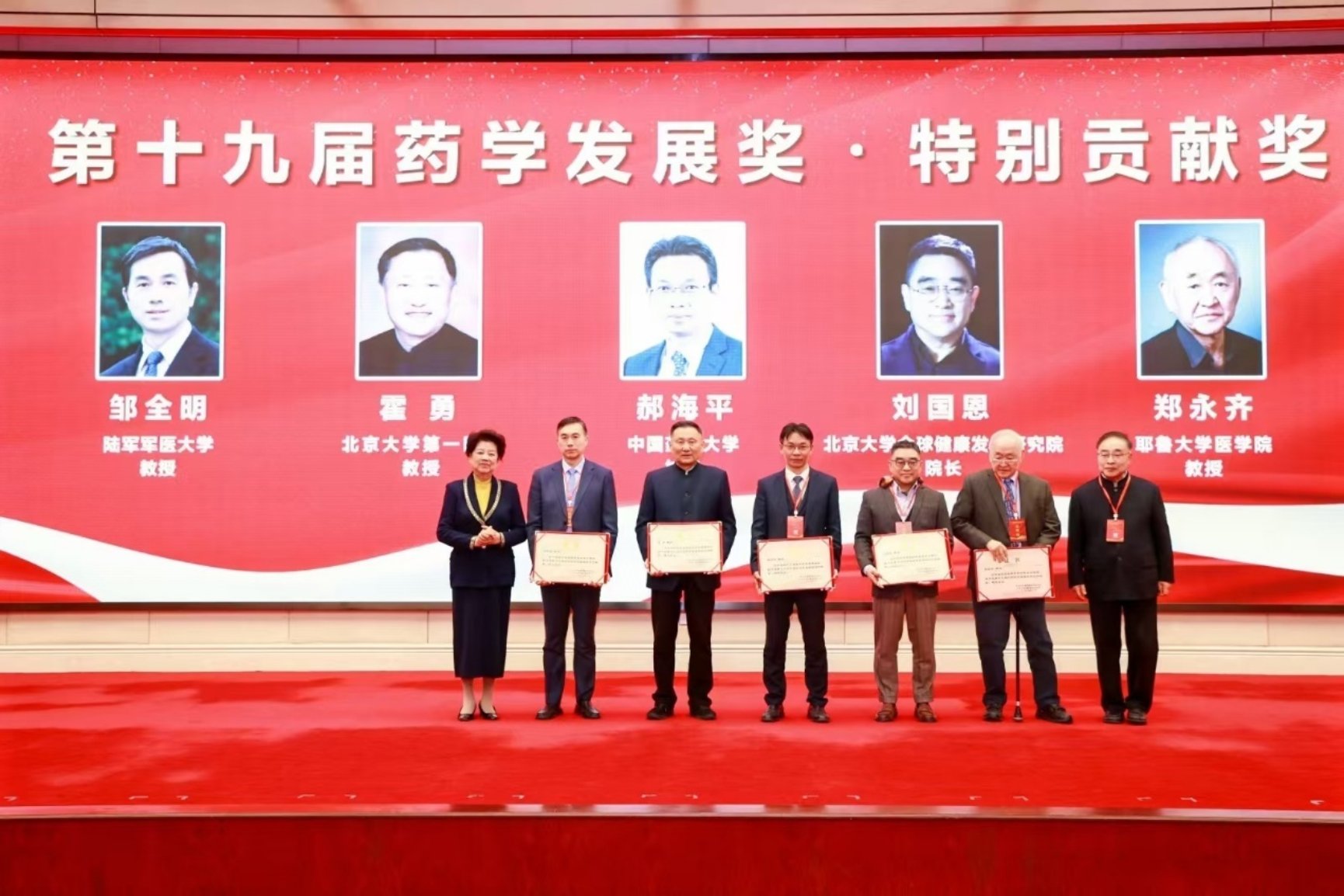 本届中国药学发展奖共评选出“特别贡献奖”5位,分别授予陆军军医大学邹全明教授、北京大学第一医院霍勇教授、中国药科大学郝海平教授、北京大学全球健康发展研究院刘国恩教授、耶鲁大学医学院郑永齐教授。