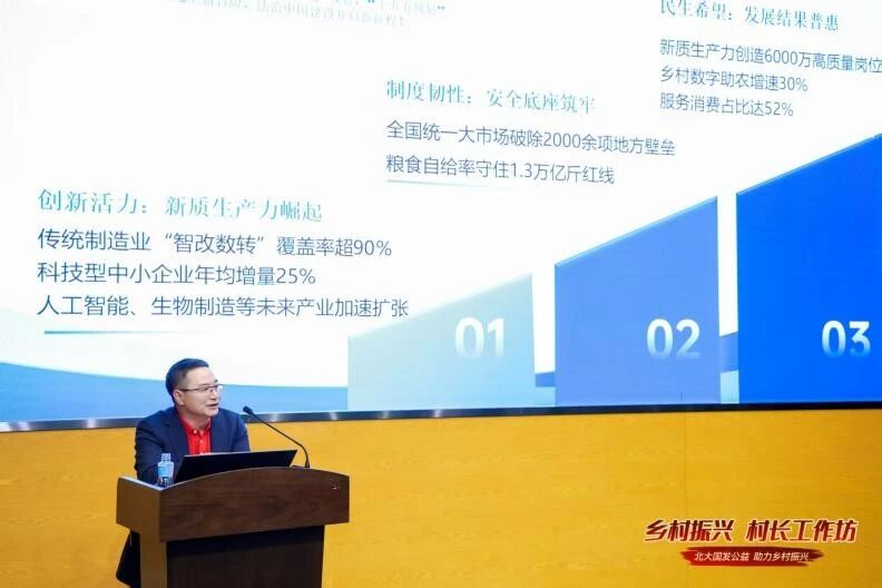 校友部老师给学员们带来了开学第一课,向大家介绍北大的文化,明确新阶段学习的目标;“村长工作坊”学术导师王超教授带来了主题为“乡村振兴与基层领导力”的分享内容;国发院经济学副教授王敏分享了对于经济规律与乡村振兴的研究;北大社会学系教授,社会学专业主任卢晖临就集体经济与乡村共同体的再造进行了讲授;北大国发院管理学助理教授、承泽企业家研修项目学术主任侯宏与点富科技创始人、灵均投资创始人兼董事长蔡枚杰分别就AI新质生产力内涵与AI工具发展与智能体应用进行了解读。