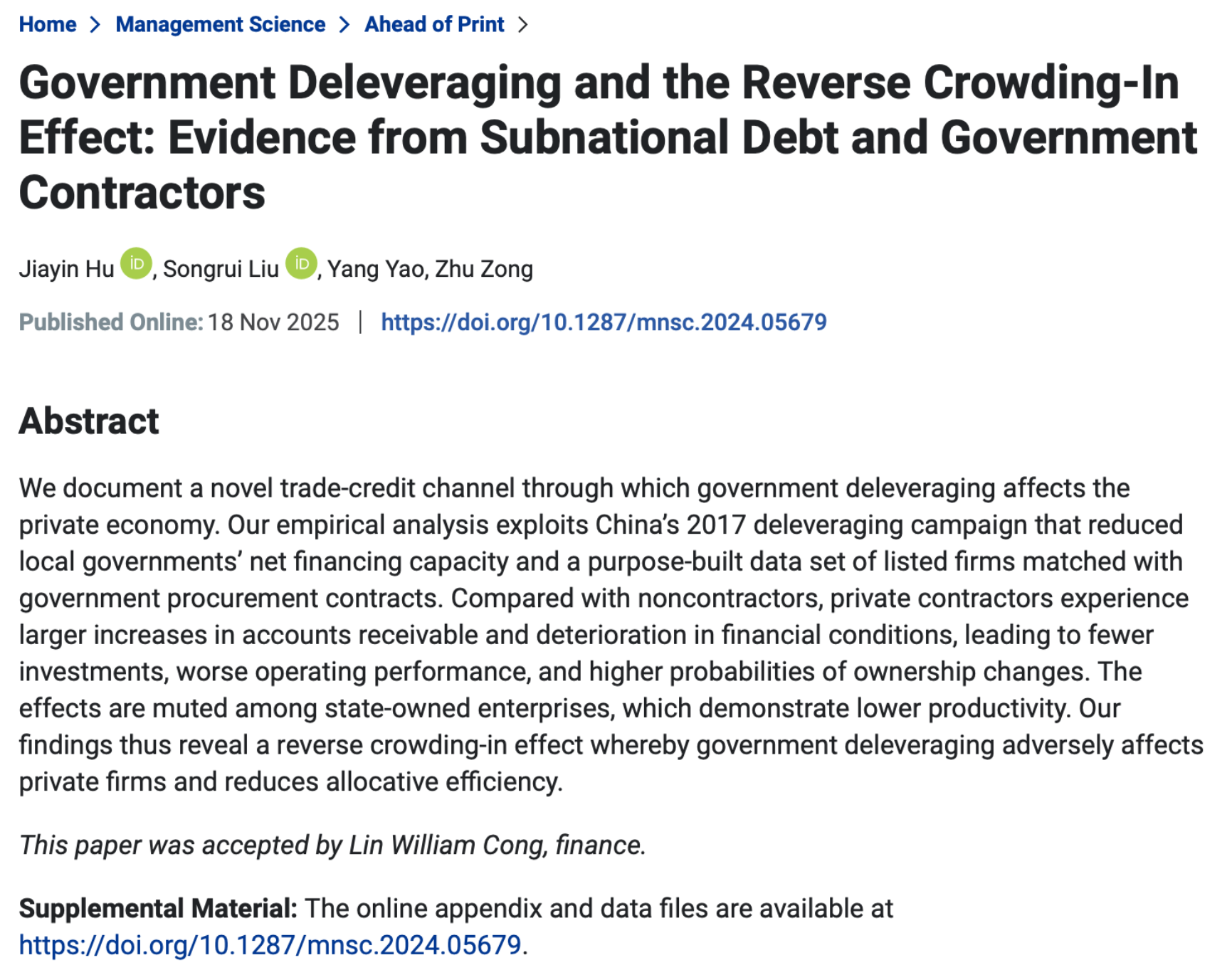 Hu, Jiayin, Songrui Liu, Yang Yao, and Zhu Zong. 2025. “Government Deleveraging and the Reverse Crowding-In Effect: Evidence from Subnational Debt and Government Contractors.” Management Science. https://pubsonline.informs.org/doi/10.1287/mnsc.2024.05679