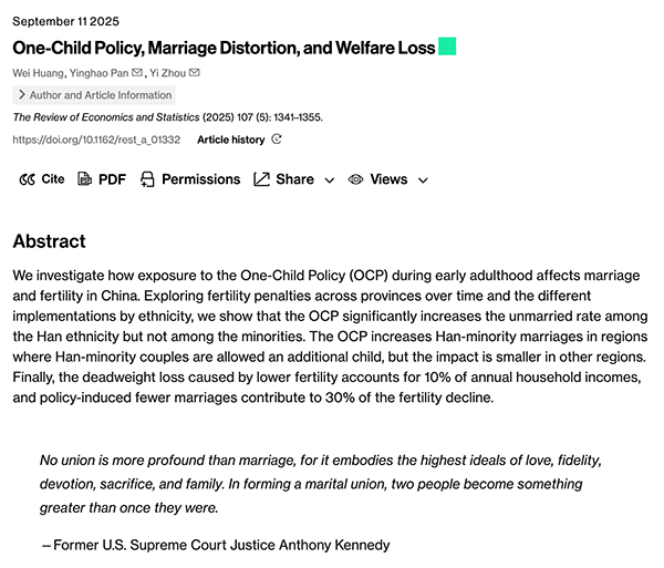 Huang W., Pan Y., Zhou Y. One-Child Policy, Marriage Distortion, and Welfare Loss. The Review of Economics and Statistics, 2025, 107(5): 1341–1355. https://doi.org/10.1162/rest_a_01332