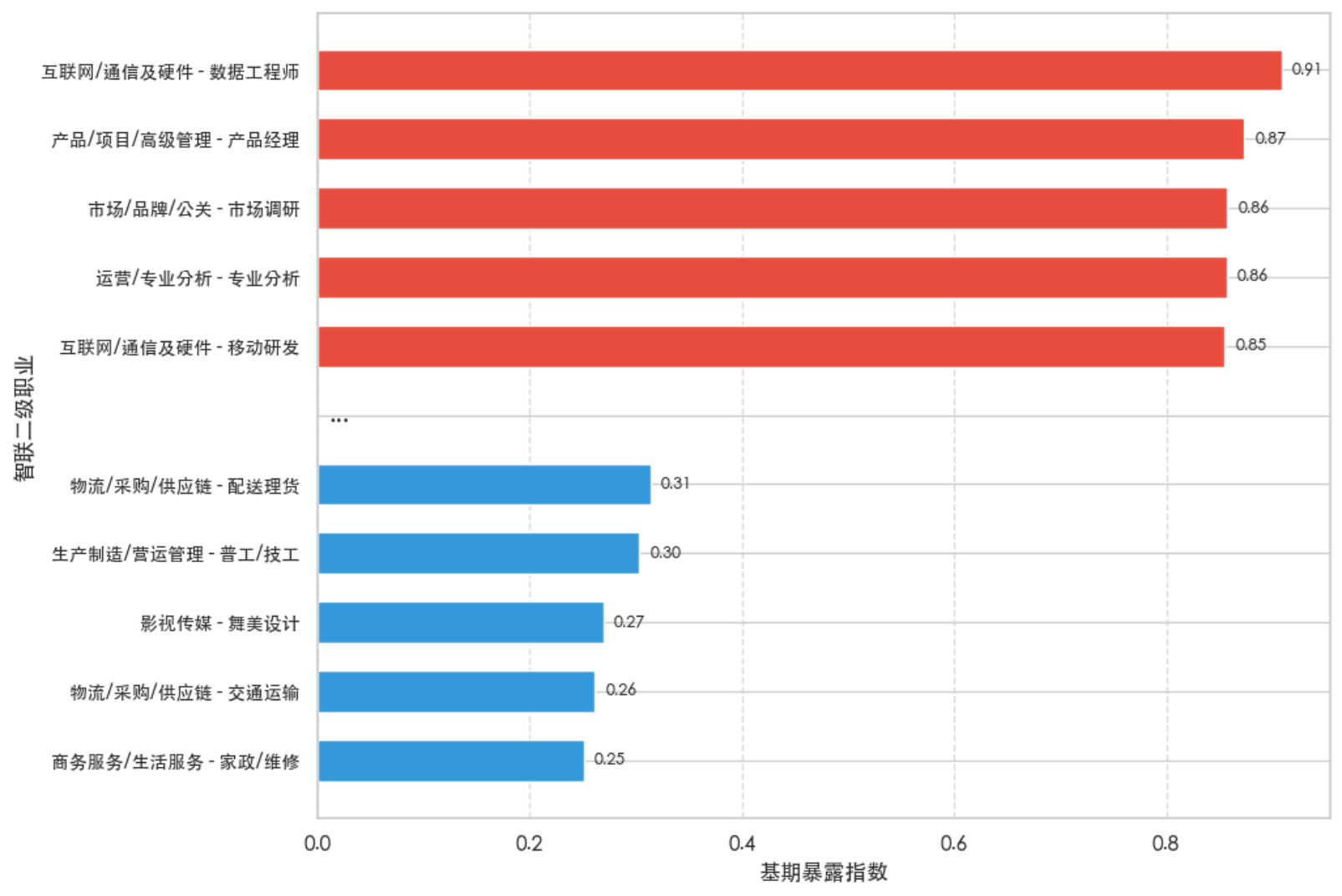 说明:根据智联招聘平台数据,本图采用基于基期(2018–2021年)按智联二级职业测算的AI-LLM暴露指数;图中红色标注部分表示AI-LLM暴露指数最高的五个职业,蓝色部分表示AI-LLM暴露指数最低的五个职业。特别地,比较范围为基期占比最高的100个智联二级职业。