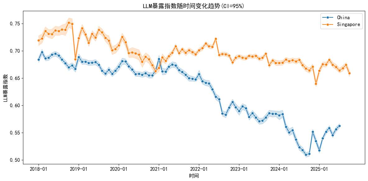 这一趋势与中国形成了鲜明对比(图1)。在大语言模型普及之前,中国劳动力市场的 AI-LLM 暴露水平虽略低于新加坡,但整体差距并不显著;而在 2023 年之后,中国新招聘岗位的 AI-LLM 暴露指数却出现了明显下降。这很可能意味着,大量易被 AI 替代的岗位已经在中国率先完成了“出清”。相反,新加坡并未出现类似的指数下滑,显示其劳动力市场在面对 AI 冲击时展现出更强的结构韧性。