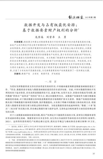 近日,我院访问教授王勇(通讯作者),与其合作者清华大学经济学研究所龙登高教授及其博士生刘紫卓合作的论文《数据开发与占有权最优安排:基于数据要素财产权利的分析》,在《经济研究》2025年第5期正式发表。