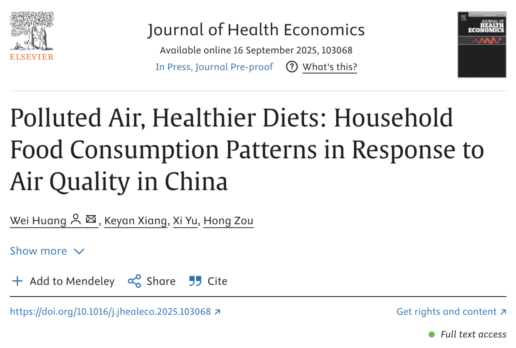 Wei Huang, Keyan Xiang, Xi Yu, Hong Zou. Polluted Air, Healthier Diets: Household Food Consumption Patterns in Response to Air Quality in China. Journal of Health Economics, in press. DOI: 10.1016/j.jhealeco.2025.103068。