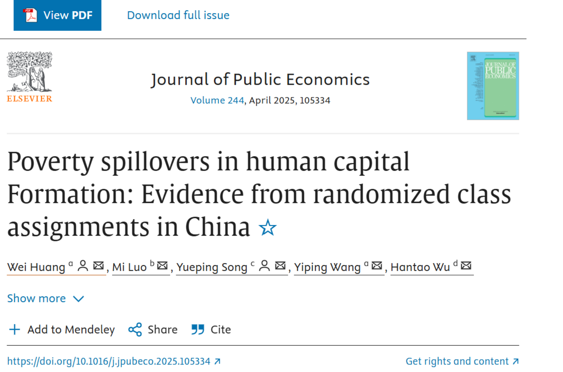 Huang, Wei, Mi Luo, Yueping Song, Yiping Wang, and Hantao Wu. "Poverty spillovers in human capital Formation: Evidence from randomized class assignments in China." Journal of Public Economics 244 (2025): 105334.
